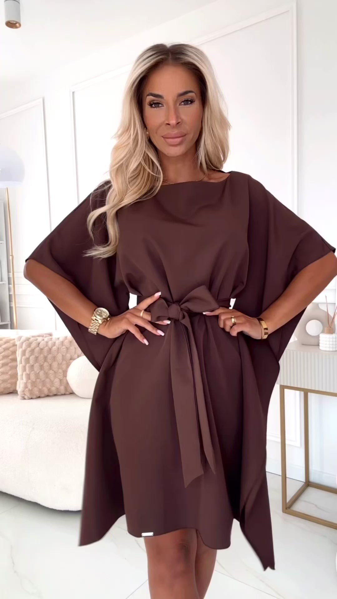 Flatterende passform med løs silhuett og justerbart midjebånd for en elegant og komfortabel look.