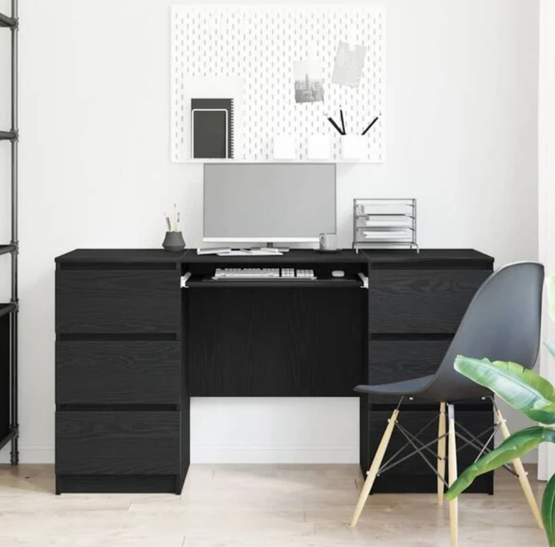 Dette svarte eikeskrivebordet kombinerer funksjonalitet med moderne stil, som gjør det til en må-ha for hjemmekontoret, soverommet eller studiet. Med sin glatte overflate og stilige design er det perfekt for skriving, databruk eller studier, og skaper et komfortabelt rom med høy motivasjon for kreativitet og produktivitet.