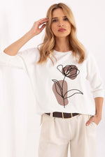 Avslappet bluse som kan tas på over hodet, perfekt for hverdagsbruk og arbeid. Laget av høykvalitets bomull med elastan, gir den komfort og perfekt passform. En modell i standard lengde med 3/4-ermer vil fungere i ulike stiler. Hoveddekorasjonen er et imponerende trykk kombinert med broderi, supplert av subtile perler som gir eleganse og feminin sjarm. Blusen passer godt til både jeans og skjørt, og skaper et stilig og komfortabelt sett for enhver anledning.