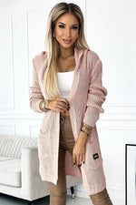 Cardigan, a warm bedspread with a hood, pockets and a patch. Made of thicker sweater material in beige color. Brand numoco. European production.