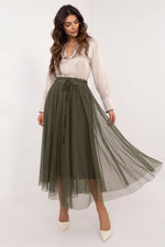 Casual tulle midi skirt, perfect for everyday outings, parties, and elegant meetings. It stands out with a smooth pattern and delicately transparent tulle, which gives the styling lightness and subtle elegance. There is a decorative tie at the waist, which allows for adjustment and emphasizes the waist. The skirt has a viscose lining, making it comfortable to wear and providing full comfort. Made of 100% polyester, it is durable and easy to care for.